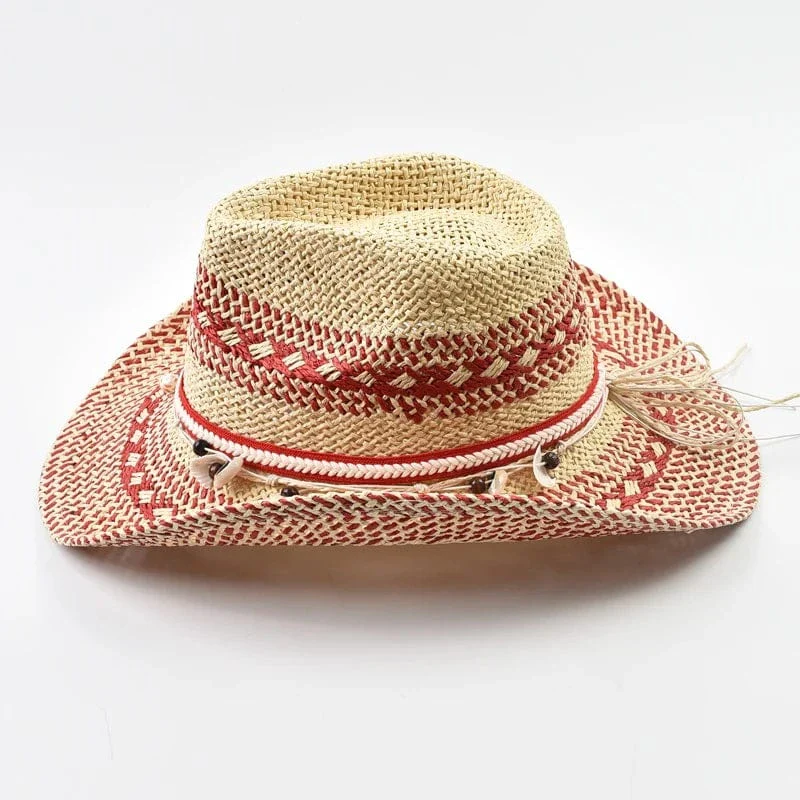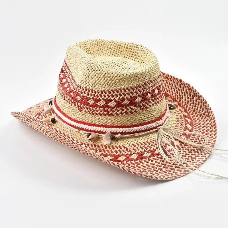 Röd cowboyhatt i naturstrå med snäckor: din perfekta sommaraccessoar