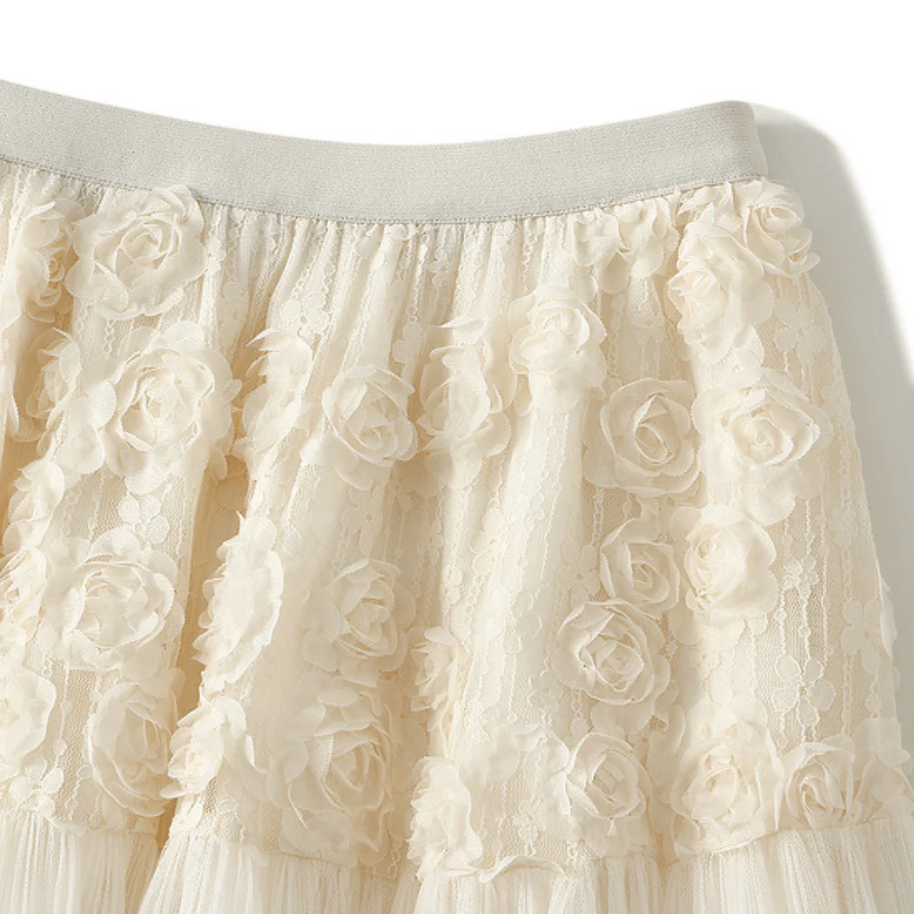 Låt denna kjol bli ditt nya favoritplagg när du vill kombinera vintage-romantik med en subtil westernkänsla. Med sina mjuka tyllveck och handgjorda rosor vid midjan ger den både elegans och charm – perfekt för både vardag och fest.