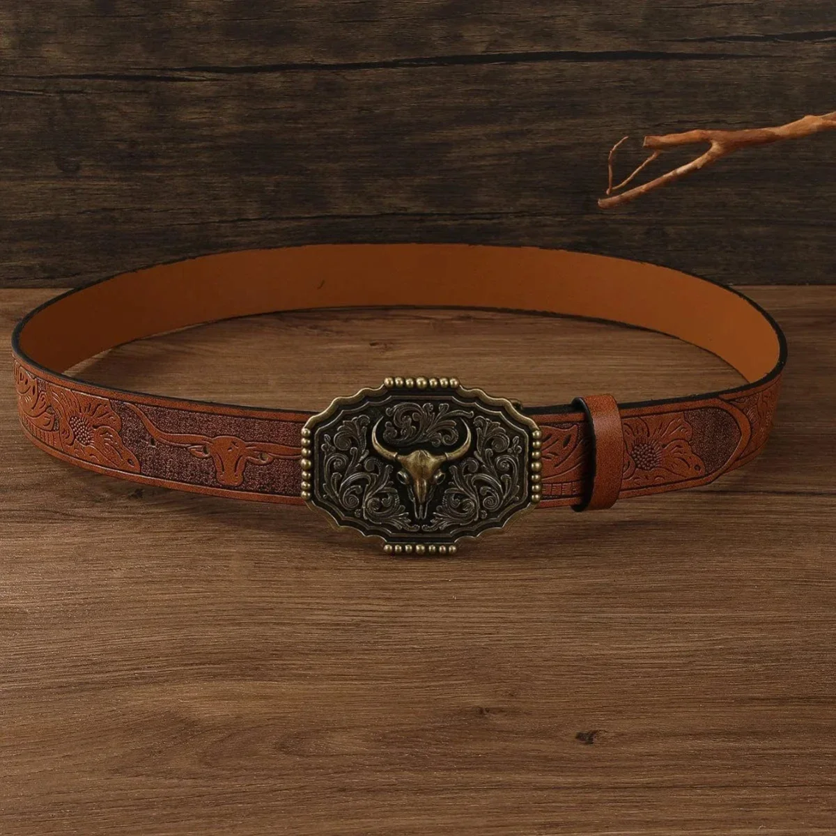 Det här bältet är gjort för dig som vågar bära en look med attityd. Den rejäla plåtspännet med präglat tjurhuvud och den rikt mönstrade läderremmen förmedlar kraft och vintagekänsla – perfekt till jeans, boots och allt däremellan.