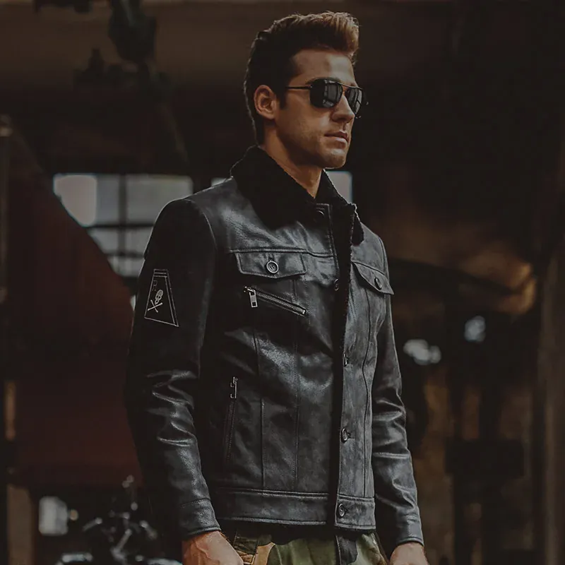 Uppgradera din vintergarderob med en Shearling jacka herr svart som utstrålar rå elegans