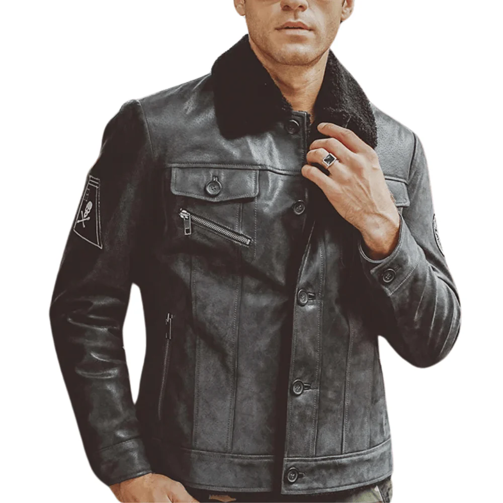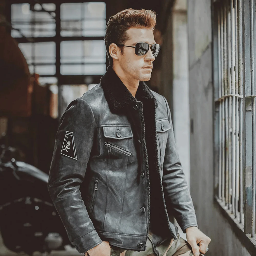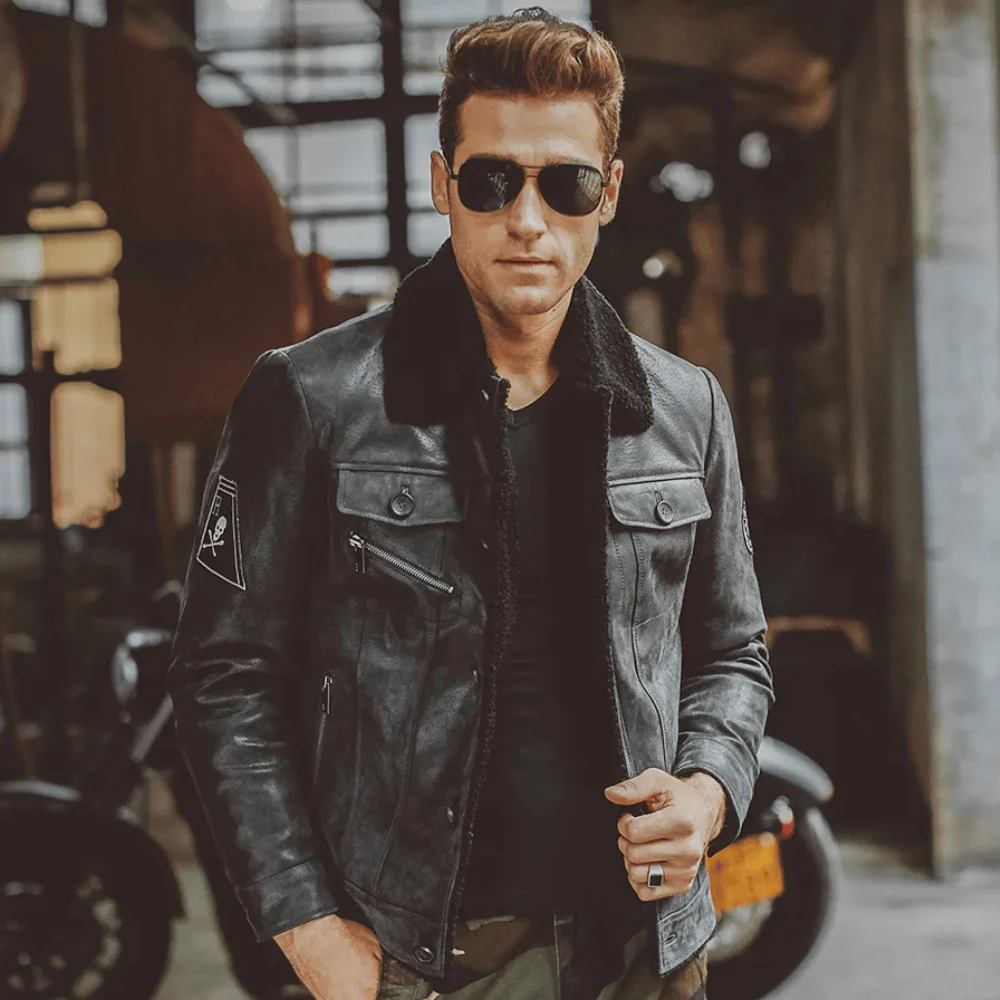 Autentisk känsla och hållbarhet: Tillverkad av äkta grisskinn som är känt för sin distinkta textur och slitstyrka, vilket ger jackan en maskulin och robust karaktär.