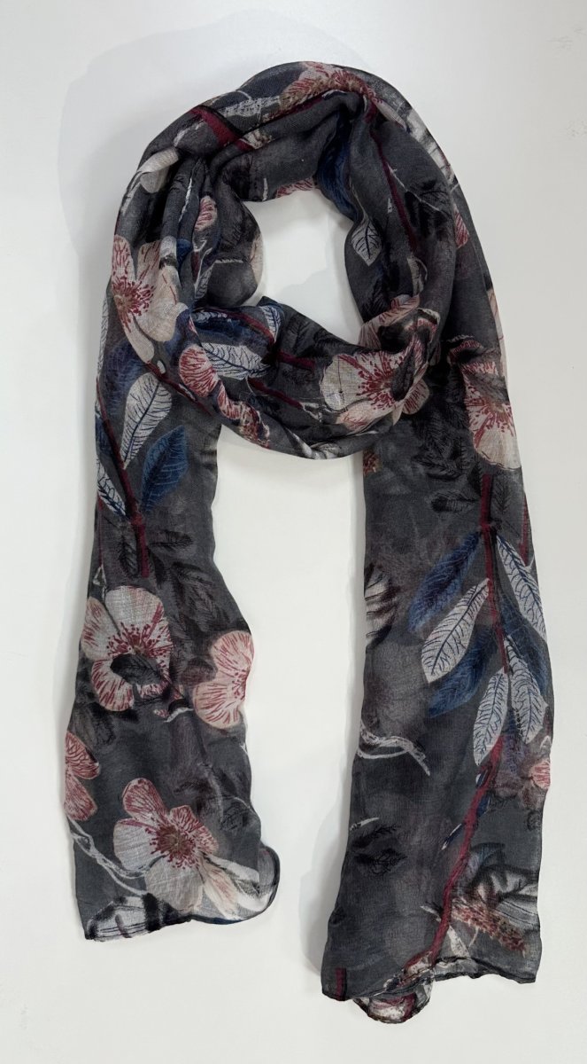 Avlång sjal med grå botten och blommönster i rosa/blå toner