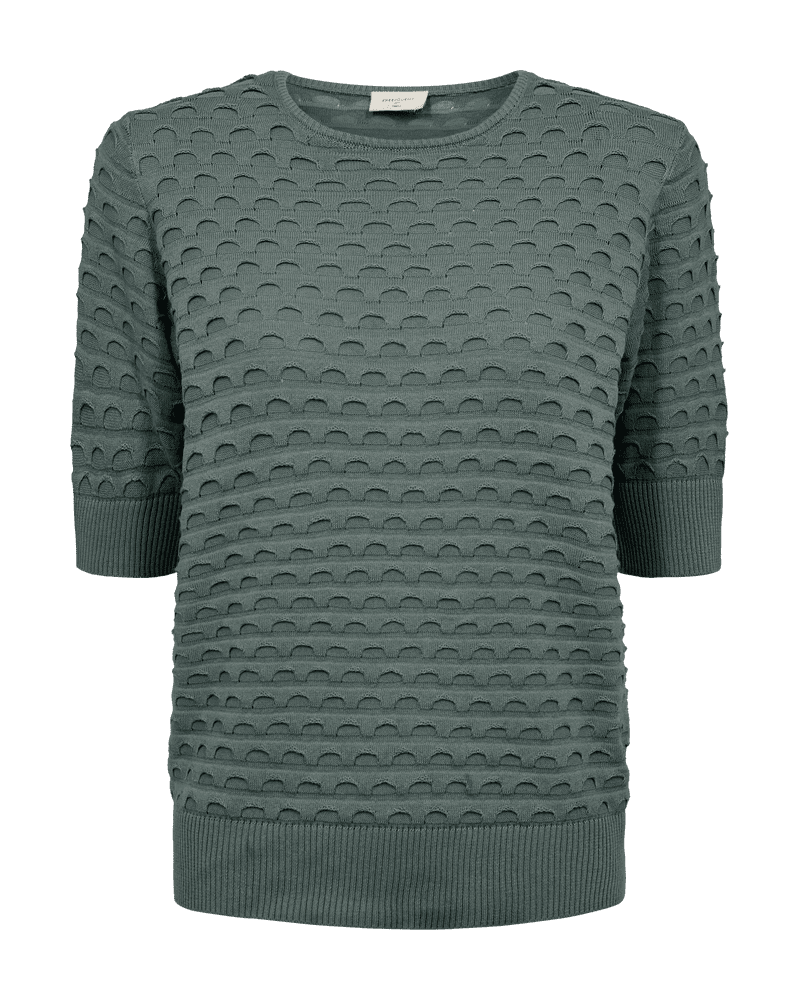 Härlig stickad tröja med fint strukturmönster och 100% ekologisk bomull från FREE/QUENT. Tröjan har rund hals och kort ärm med resårmudd vid ärmslut samt även nedtill.