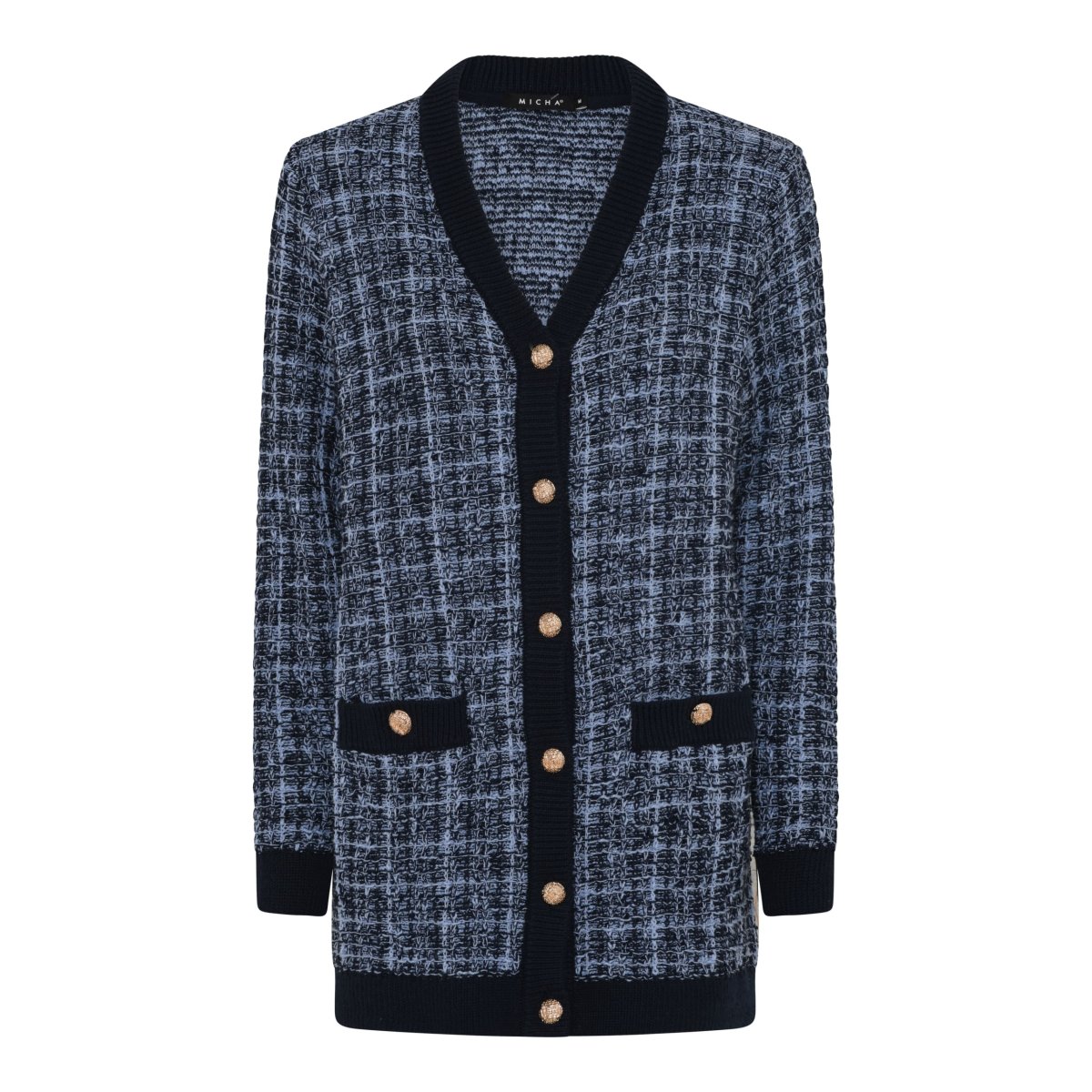 Snygg strukturmönstrad stickad cardigan från Micha med fina guldiga detaljer och fickor fram.