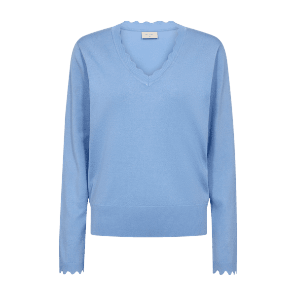 Denna stickade tröja i blå färg från FREE/QUENT. Tröja är v-ringad med vågig detalj och har lång ärm med vågig detalj samt lite bredare mudd nedtill.