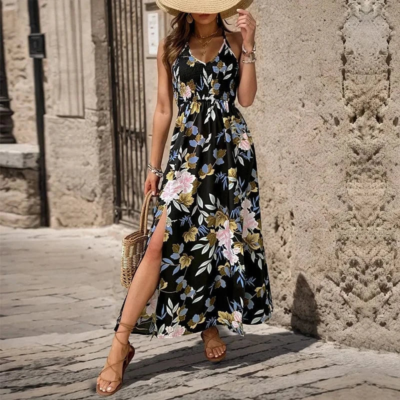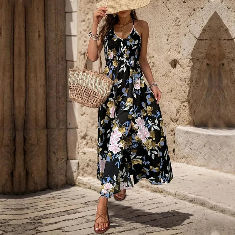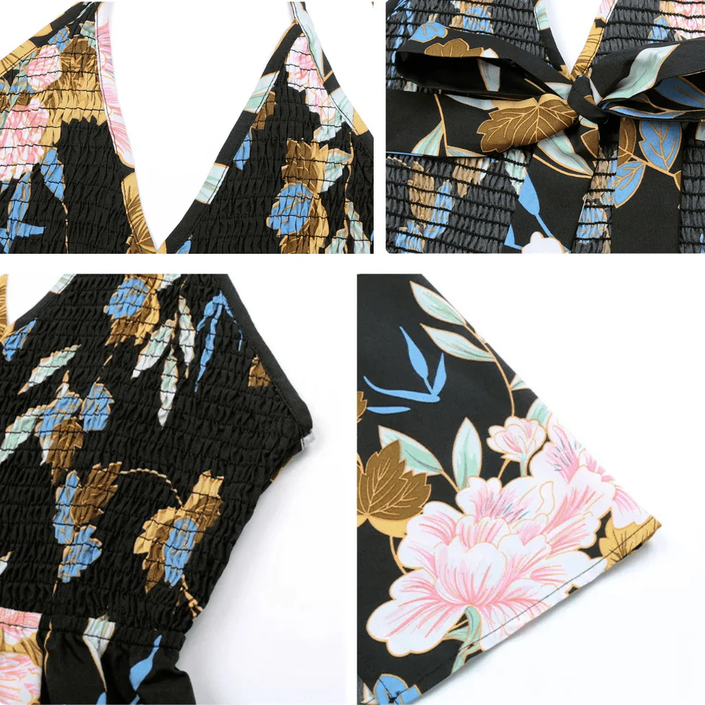 Låt sommaren blomstra med denna eleganta svarta klänning med blommor. Perfekt för varma dagar, strandpromenader eller en romantisk middag under stjärnorna.