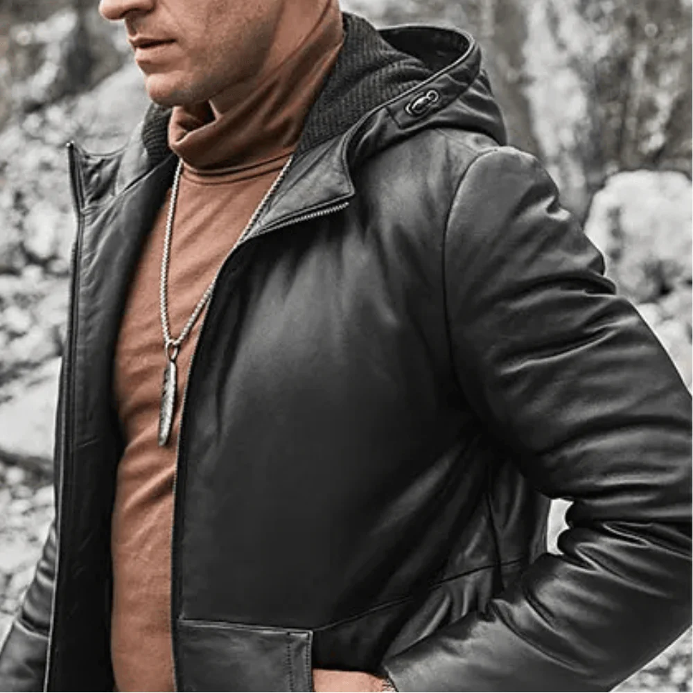 Svart läder dun hoodie jacka herr som ger dig värme, kraft och tidlös cowboy-attityd