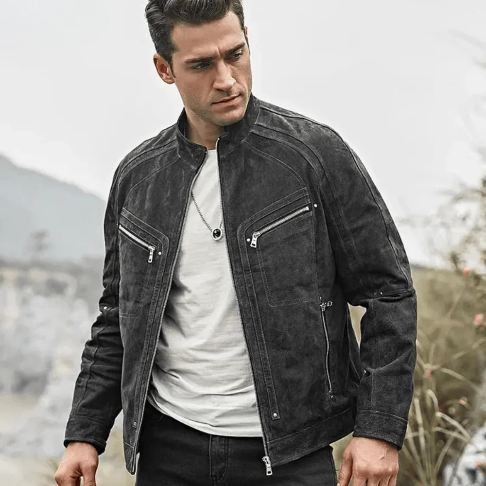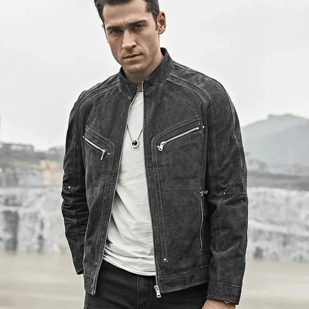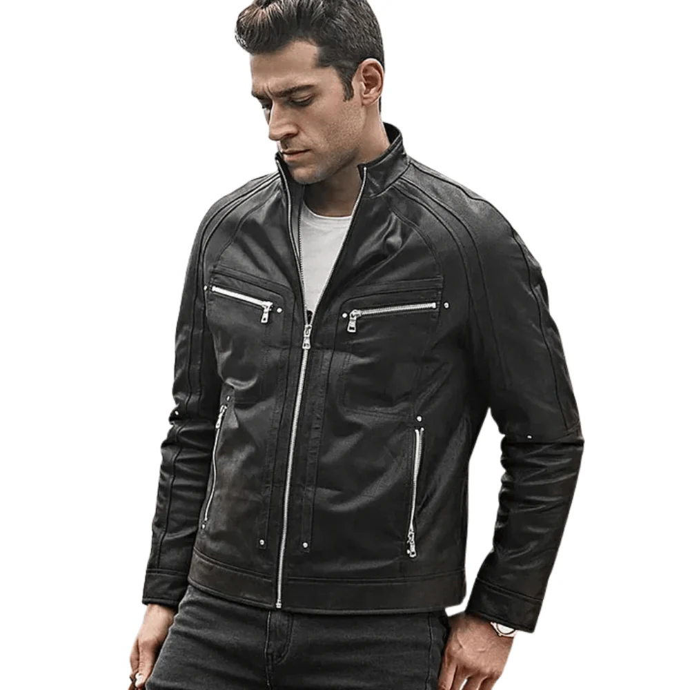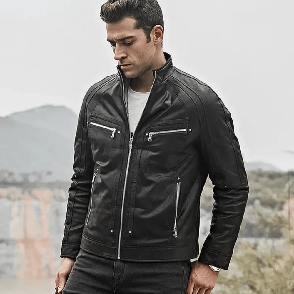 Känn hur din siluett skärps och din stil förstärks med denna svarta MC-jacka i äkta skinn – skapad för dig som vill bära robust elegans utan att kompromissa med komfort. Den följsamma pigskinnskvaliteten, den stadiga ståkragen och de rena linjerna ger jackan en look som både känns äkta och modern. Ett perfekt plagg för dig som älskar friheten, vägarna och en touch av vilda västern.
