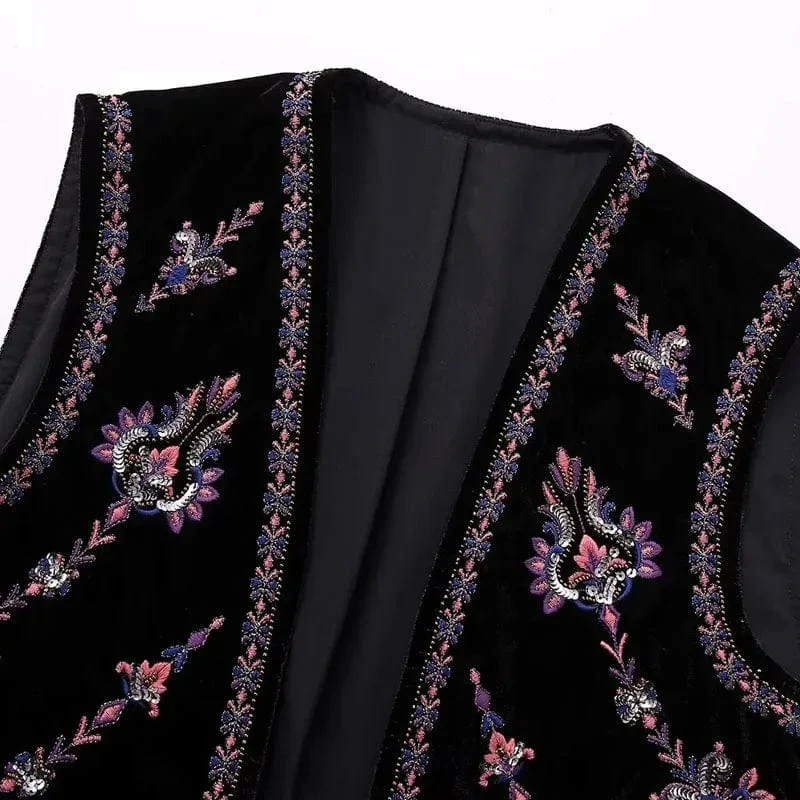 Svart Sammetsväst med Rosa Lila Silver Paljetter Broderi: för en touch av magisk western-glamour
