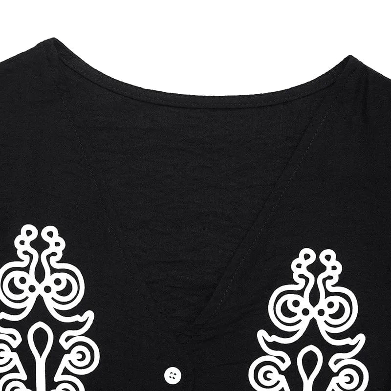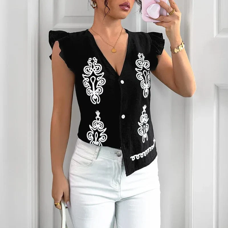Låt din stil få andas lätthet, självsäkerhet och en touch av modern cowboy-romantik. Den här svarta sommarblusen i Y2K-stil kombinerar feminina detaljer med en luftig passform som gör den perfekt för allt från lata dagar i solen till sommarkvällar med boots och denim. De dekorativa vita broderierna skapar en vacker kontrast som drar blickarna till sig – utan att du behöver anstränga dig.