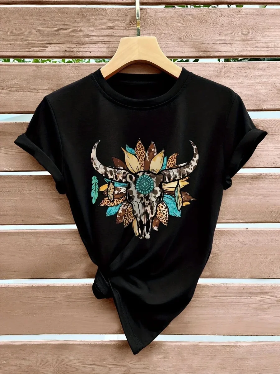 Svart tshirt med buffelkranium fjädrar – skapa din unika westernstil