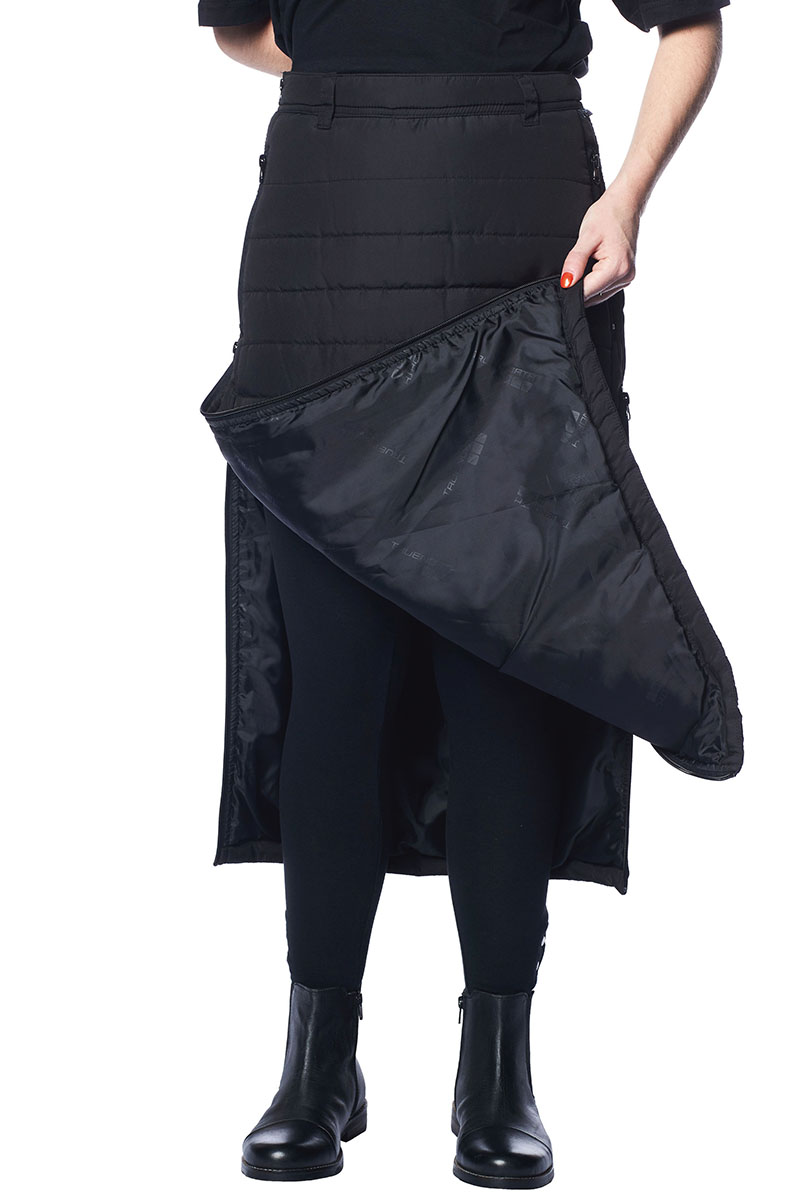 Täckkjol i varmfodrad quiltad polyester. Resår i ryggen. Hällor för skärp, fickor fram med blixtlås.