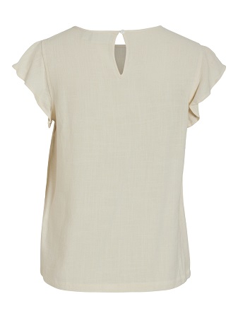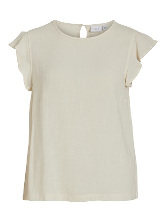 Fin kortärmad topp med volangdetaljer från Vila. Toppen har en rund halsringning med fina volangdetalj på ärmen. Toppen knäpps med en knapp i nacken och har en normal passform.