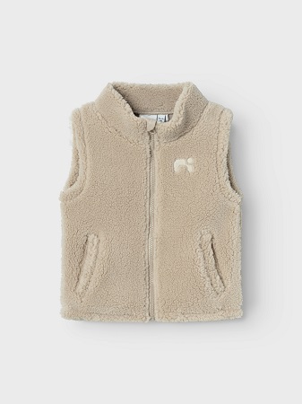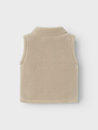 Snygg och mjuk väst i teddyfleece från Name It. Västen är i ett mjukt och lätt material med lurvig yta. På vänster bröst finns en dekorativ detalj. Västen öppnas fram med en genomgående dragkedja med hakskydd. På framsidan finns praktiska öppna fickor.