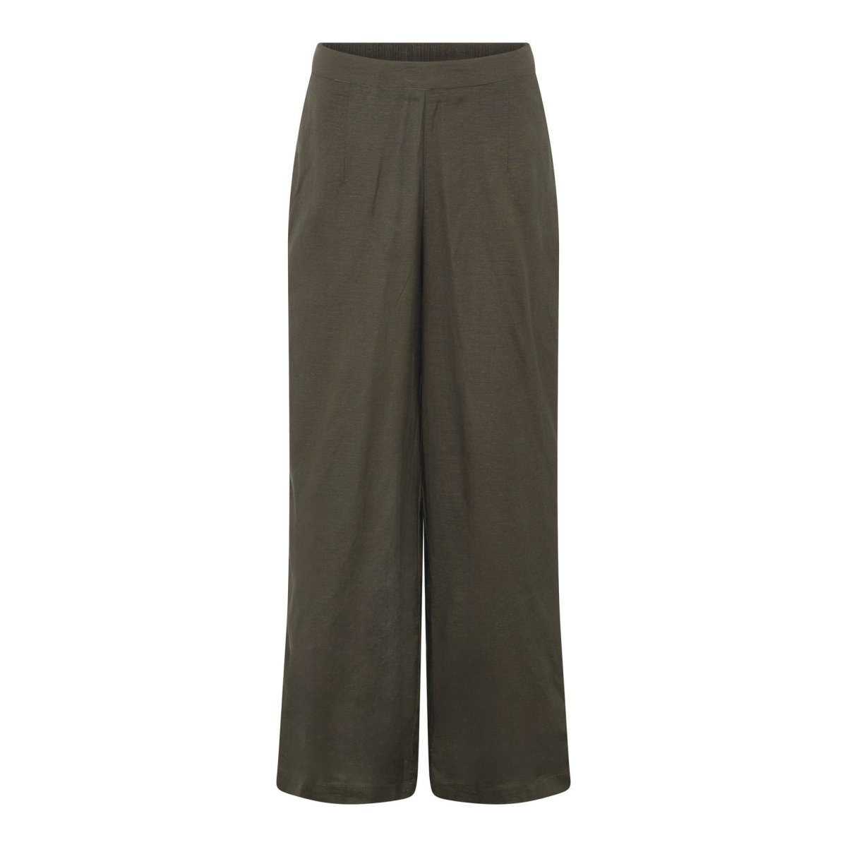 Fin vid mörkgrön byxa från Soulmate. Byxan har resår i midjan och sneda framfickor.