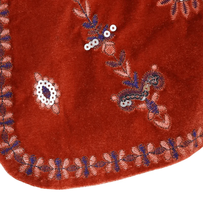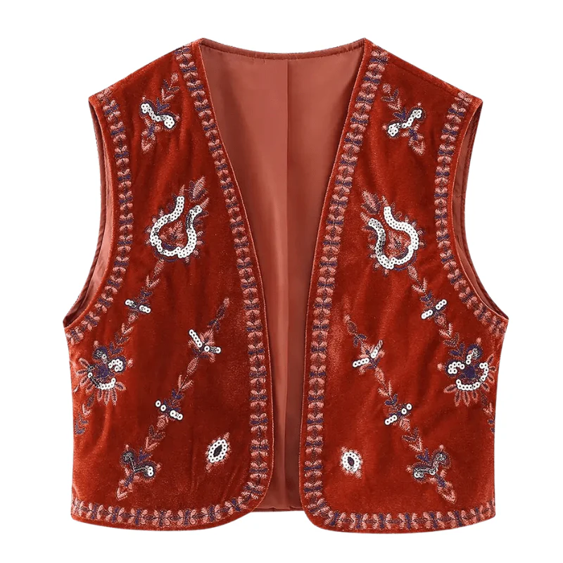 Låt din stil blomstra med denna fantastiska väst i mjuk sammet, dekorerad med gnistrande paljetter och broderier som fångar ljuset vid varje rörelse. Perfekt för att ge din outfit en varm och personlig touch – vare sig du bär den över en blus, klänning eller t-shirt.