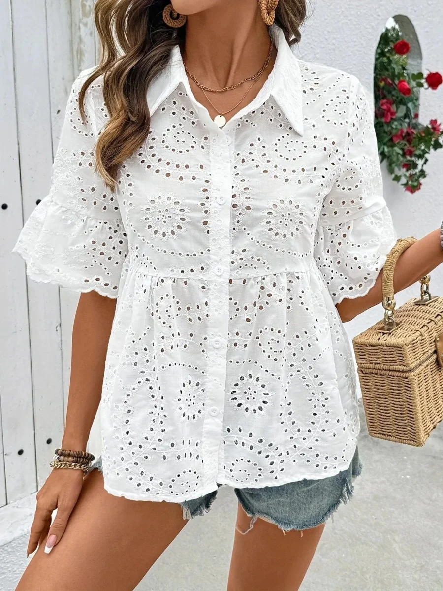 Skapa en tidlöst chic look med denna vita blus i broderie anglaise. Med sitt vackra hålmönster, lekfulla volangärmar och avslappnade passform ger den en romantisk och luftig känsla – perfekt för soliga sommardagar och kvällar vid havet.
