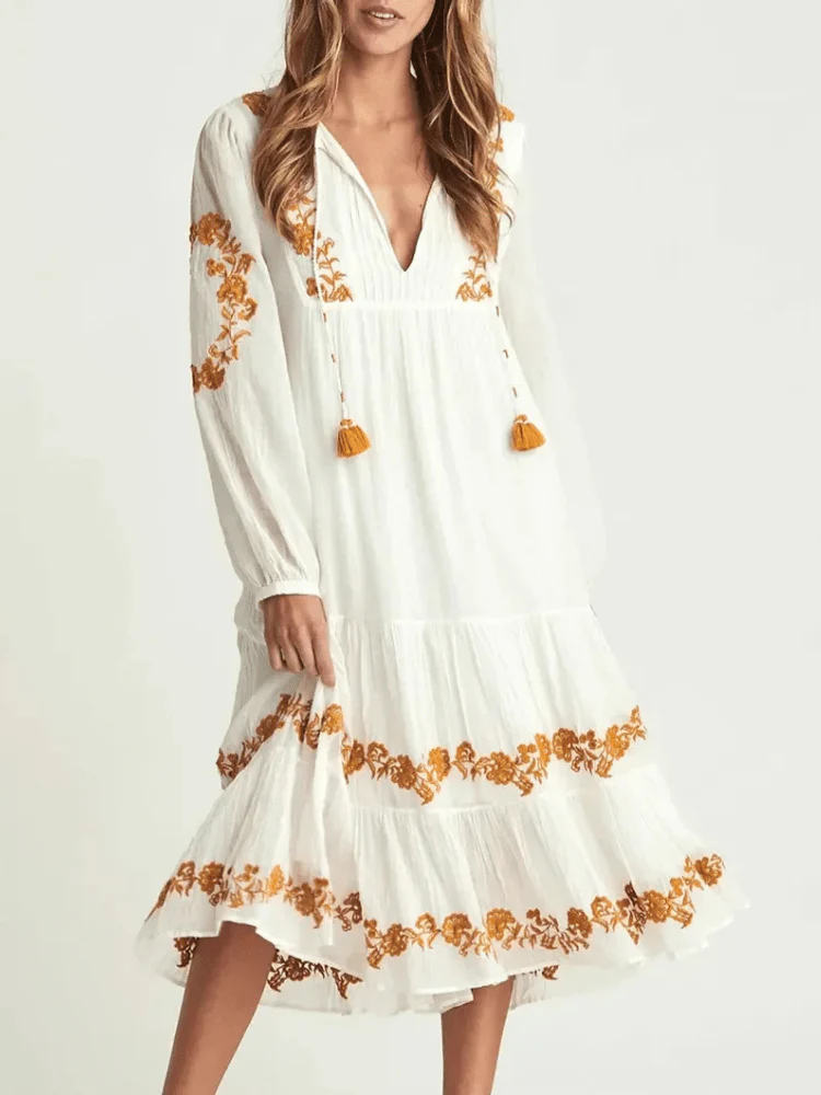 Vit bohemisk klänning med broderi – perfekt för en romantisk sommardag