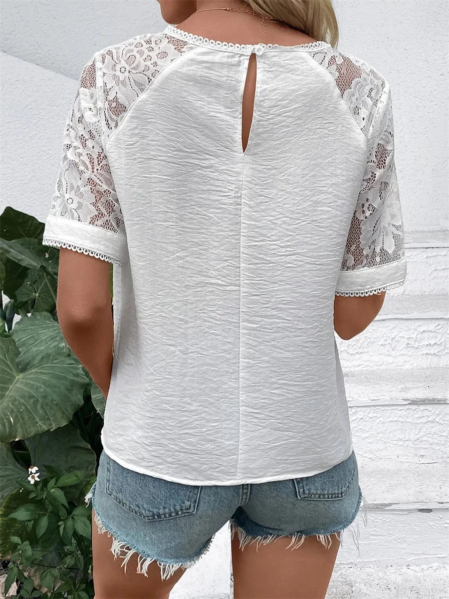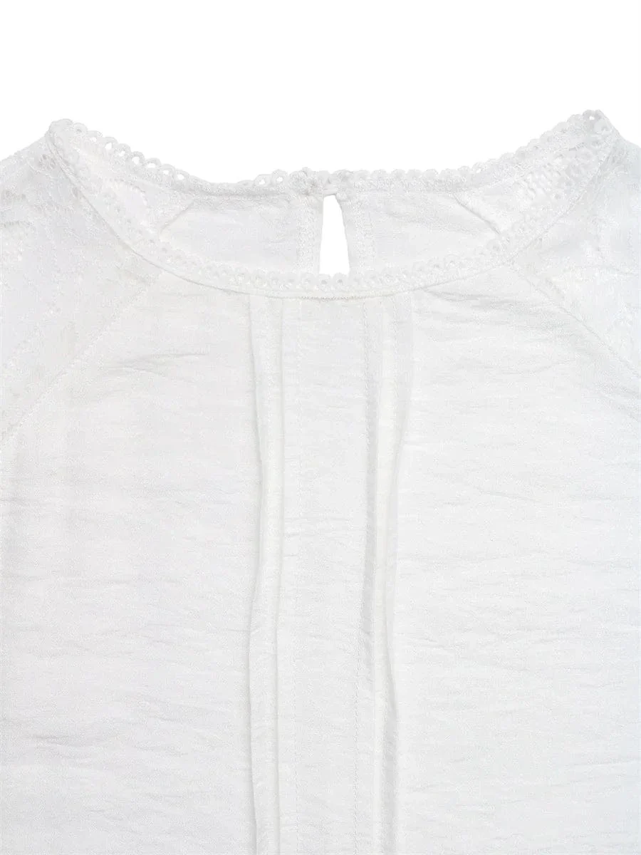 Ge din garderob en elegant uppdatering med denna vita romantiska blus. De plisserade detaljerna och de subtila spetsinslagen skapar en luftig och sofistikerad look som passar perfekt för sommardagar och kvällar vid havet.