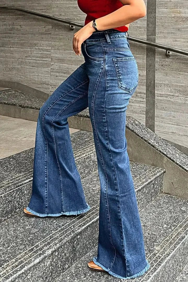 Låt varje steg du tar andas vintage självsäkerhet. Dessa westerninspirerade bootcut jeans med hög midja och rå fåll ger dig en bekväm silhuett med karaktär – perfekt från stadsgator till lantlig frihet.