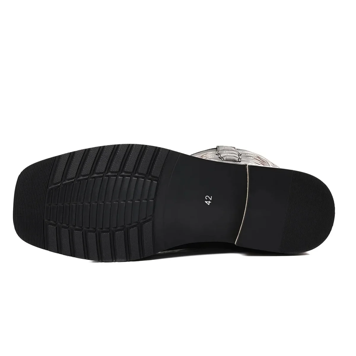 Sätt på dig dessa Western boots för herr och känn kraften i varje steg. Inspirerade av autentisk cowboykultur, kombinerar de rustik charm med en elegant finish. Den mönstrade ytan och de kontrasterande sömmarna ger varje par en tidlös karaktär som passar både till vardagsjeans och till mer stilfulla outfits.
