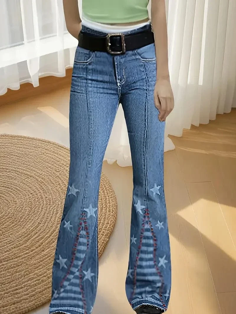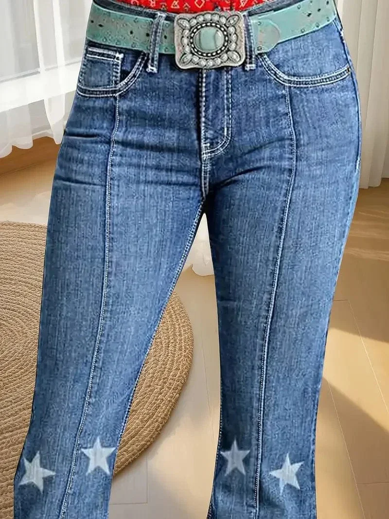Ge din vardagslook en lekfull twist med våra western jeans dam – en utsvängd modell med stjärnapplikationer och kontrastpaneler som andas frihet och självförtroende.