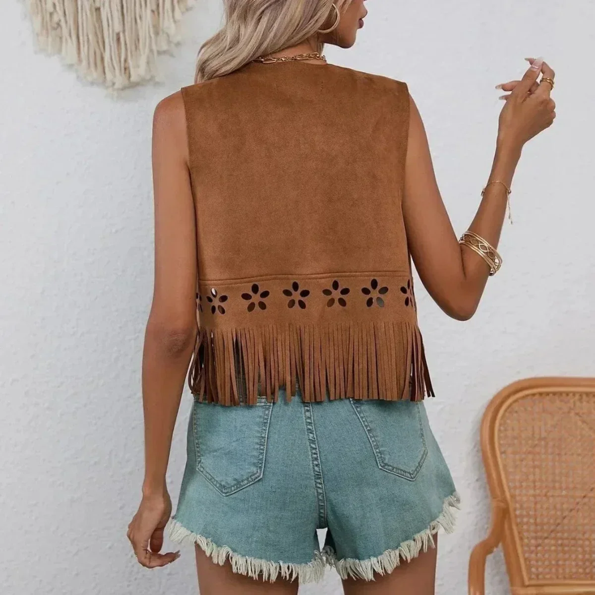 Denna väst kombinerar vintage-västernkänsla med modern bohochic – perfekt att bära över en enkel topp och shorts för festival, vardag eller en kväll på stan. Detaljer som laserutskurna blommönster och mjuka fransar ger en unik look som drar blickarna till sig.