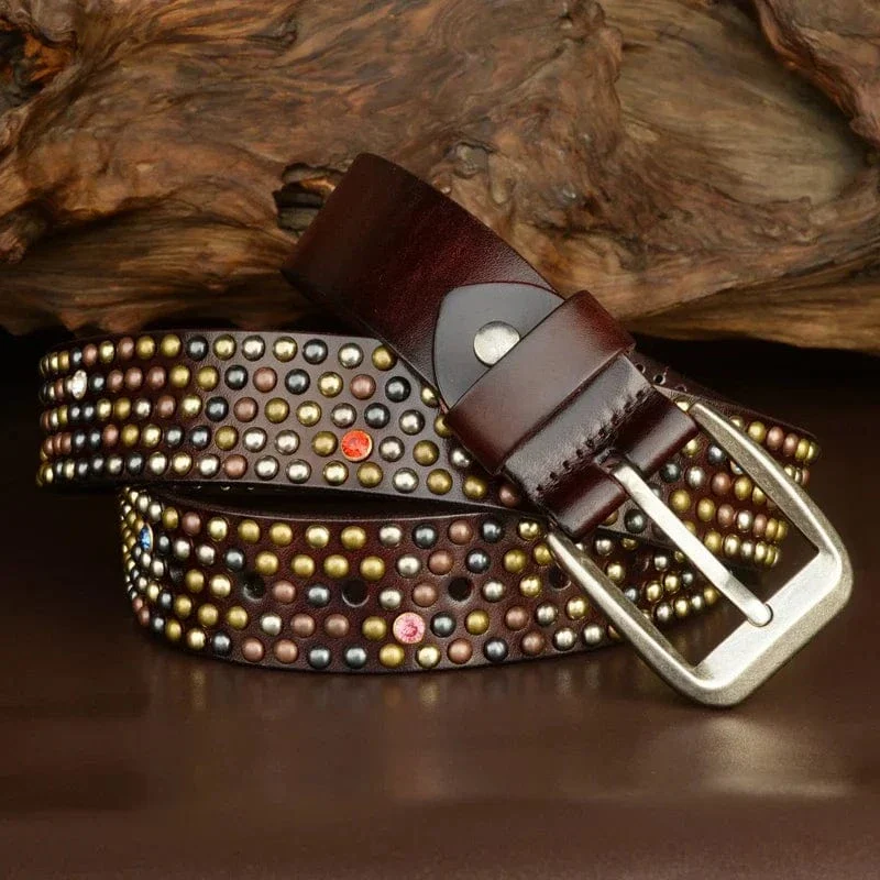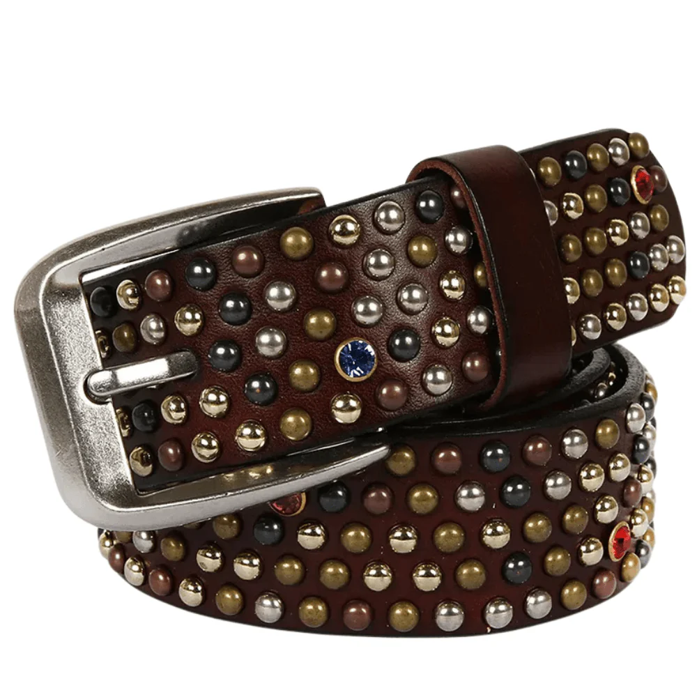 Sätt tonen med ett westernbälte som aldrig försvinner i mängden. Det här är din nyckel till en edgy, elegant look – tillverkat i kraftigt äkta läder, smyckat med metallnitar och färgade stenar i noggrant utplacerade mönster. En accessoar som tar plats – med stil.