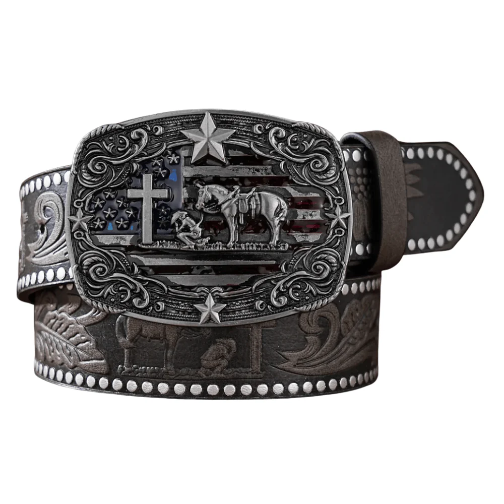 Låt ditt bälte tala för dig. Det här utsökta westernbältet kombinerar klassisk cowboyestetik med en kraftfull symbolik: en detaljerad cowboy prayer mot bakgrund av den amerikanska flaggan. Perfekt när du vill uttrycka både stil och styrka i varje steg du tar.