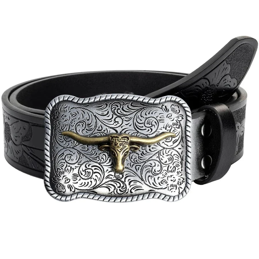 Det här westernbältet är designat för dig som älskar cowboyestetik med karaktär. Med sitt iögonfallande spänne i form av ett långhorn och detaljerade blommönster, ger det en autentisk känsla av vildmark och vintage.
