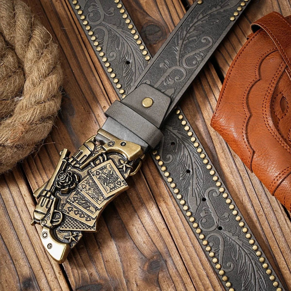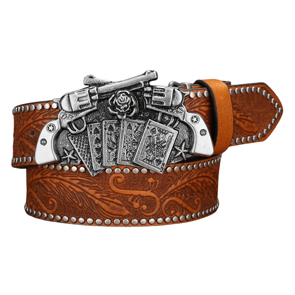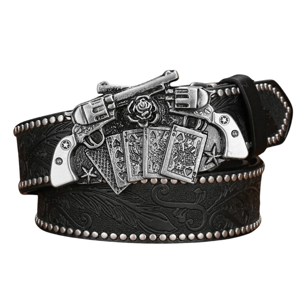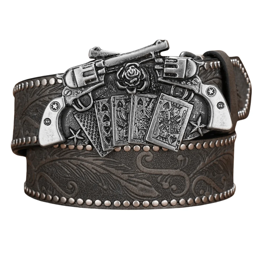 - Unik design: Det ikoniska spännet med revolvrar och spelkort skapar en autentisk westernkänsla.