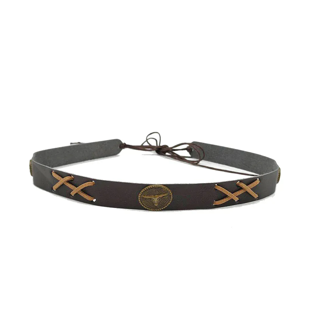 Låt ditt favorit-hattval få den där extra autentiska westernkänslan med vårt eleganta Westernhattband i läder med oxemblem. Ett tidlöst accessoarval för dig som älskar cowboyestetik, hantverkskänsla och subtil attityd. Det här bandet förvandlar vilken hatt som helst till ett statement.